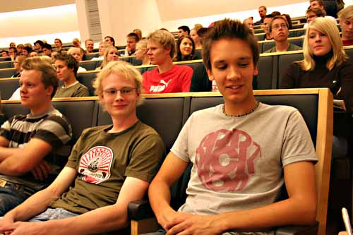Fuksisyksyn satoa Syksyn 2006 fuksit kuvasivat oloaan oudoksi. Tuomas Kangasniemi "Yleisin kysymys on kyllä ollut, että missä on A-sali", sanoi TKK:n suunnittelija Milla Vaisto-Oinonen. "Mutta tervetuloa, tässä mikään kysymys ei ole liian tyhmä." Guru ry:n puolesta pöydän takana seissyt Juha Peltonen täsmensi pilke silmäkulmassa toimintaideaa: "Ei meidän tarvitse miettiä, mitä tässä kysytään. Tämä on asiakaslähtöistä palvelua." Laajan oppimäärän opiskelijoille Peltonen ehdotti vinkiksi matematiikan luentojen hyödyntämistä muualla: "Ei kannata keskittyä pelkkään matikkaan. Luennoilta voi oppia asennetta ja opiskelutekniikkaa, jotka auttavat muualla." Opintosihteeri Hanna Koskisto puolestaan suositteli TKK:n ilmaisia jumppavuoroja, joissa kuulemma käy ilta-aikaan paljon opiskelijoitakin. A-salissa syksyn 2006 fuksit kuvasivat oloaan oudoksi, uteliaaksi ja pelottomaksi. Moni kertoi tienneensä jo pienenä poikana ja tyttönä halajavansa tekniikanopintojen pariin. Juho ja Teemu olivat tutustuneet jo Varaslähtö-tapahtumassa kesällä. Pojat osasivat vastata oikein, miksi TKK:lle oli tultu. "Eikös tää oo ainut oikea paikka." Pojat toivovat fuksisyksyn tuovan aktiviteetteja ja juhlintaa. "Ja ehkä vähän opiskeluakin siinä sivussa." Antti ja Julius tuntevat toisensa jo Nousiaisten lukiosta ja nyt kaverukset ovat päätyneet TKK:lle opiskelemaan. Pojat miettivät, että TKK:lla pitäisi olla puolet tyttöjä, mutta tuumaavat sen jälkeen, että oman kullan ei tarvitse olla teekkari. "Tiina" kertoo tulleensa opiskelemaan TKK:lle, koska täällä on paljon miehiä ja täällä ryypätään. Kemian tekniikan hän valitsi, koska tislaus kiinnostaa. Toimittajat menivät hämilleen suorasukaisesta vastauksesta, mutta edes kemiaa opiskeleva valokuvaaja ei tunnistanut juonta, vaan innostui kertomaan Tiinalle osaston kurssitarjonnasta. Päivitetty 13.9.2006 tulostusversio |