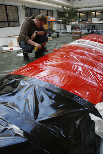 Koneteekkari Matti Muhonen tasoittaa silitysraudalla liidokin siipeä. Viikonlopun mainostempauksessa Sweco Industryn työntekijät työntävät liidokin väliaikaiselta kiitoradalta alas Hakaniemen Siltavuorensalmeen.